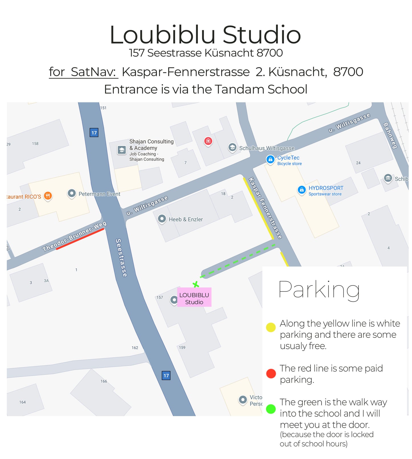 Meeting point (on the first visit) is in the playgound of the school, I will come down to meet you and show you where the studio is, then you are free to drop off/pick up as you like.